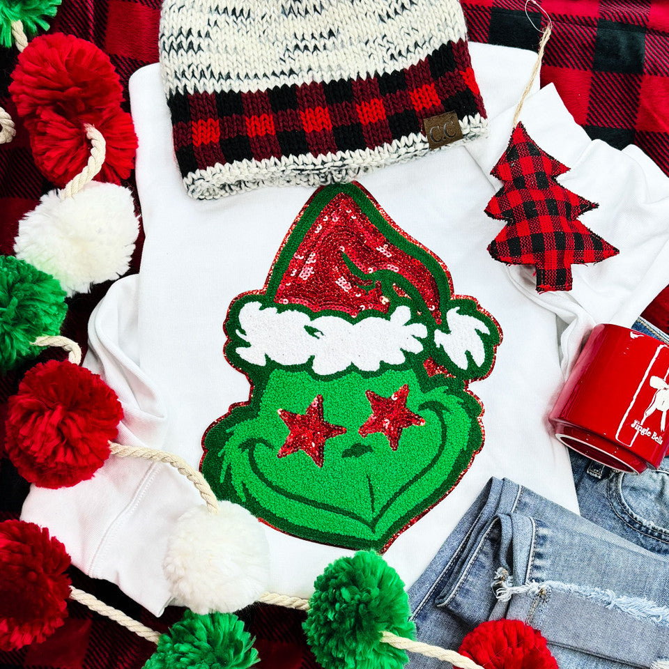 REAL SEQUIN PATCH Green Star Eye Guy White Short & Long Sleeve Tees OR Sweatshirts - YOUTH & ADULT SIZES